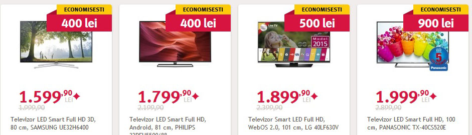Daca va doriti un televizor ieftin (oferta incepe de la 429,90 de lei si urca pana la 39.999 lei), unul cu diagonala mare, cu rezolutie inalta Ultra HD, cu tehnologie 3D sau cu ecran curbat, in oferta Black Friday la Altex le puteti cumpara pe oricare dintre ele cu discounturi semnificative (reduceri de pana la 8.000 lei).